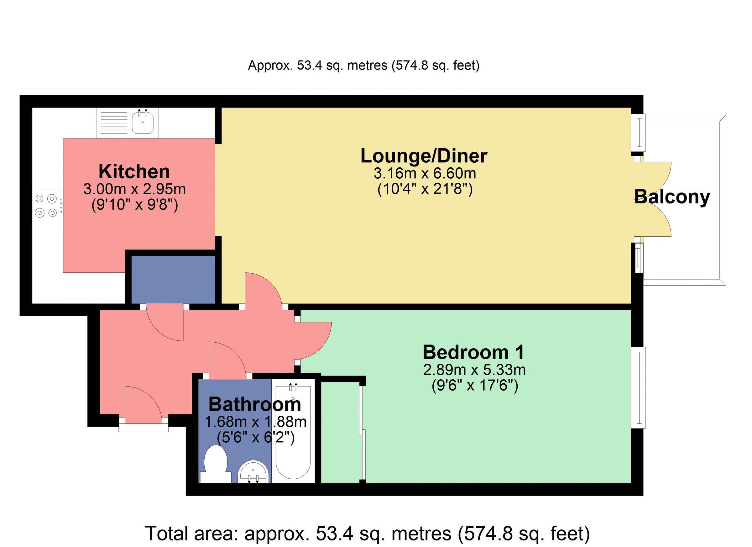 A spacious one-bedroom first floor apartment in a modern development, offering well-proportioned accommodation and contemporary finishes.The property comprises an entrance hall, a bright living room with balcony, an open-plan fully integrated kitchen with breakfast area, and a modern bathroom. Additional features include double glazing and a secure allocated parking space accessed via electric gates.Measuring approximately 574.8 sq ft (53.4 sq m), the apartment is offered unfurnished and is available from 27th February 2026.