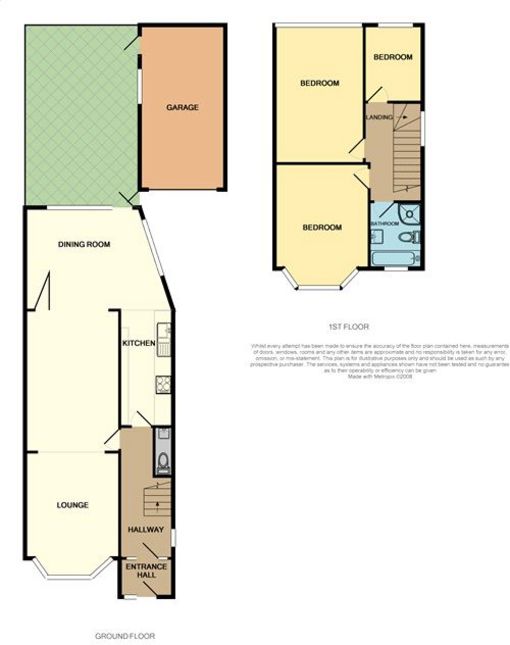 Suite comprising panelled bath with shower over, wash hand basin, w/c, shower cubicle, heated towel rail, tiled walls and floor, frosted window.