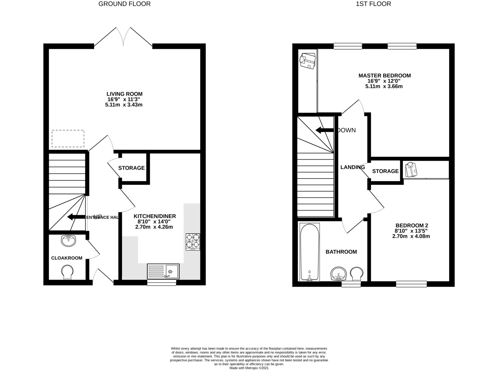 The property itself offers entrance hallway, downstairs cloakroom, kitchen/dining room and living room with doors to garden. Upstairs landing area with storage, two bedrooms and bathroom with shower over bath.