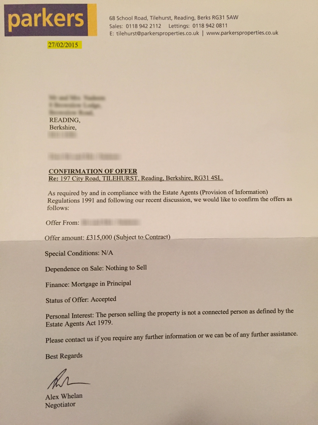 A self-explanatory example of Parkers Gazumping cheap practices! Sent: 25 February 2015 16:13:03 To: tilehurst@parkersproperties.co.uk (tilehurst@parkersproperties.co.uk) Hi Dan, Thanks for your call confirming the acceptance of offer. Please find attached assessment in principle done by Halifax earlier. From: alex.whelan@parkersproperties.co.uk Sent: 27 February 2015 14:39:01 An offer of �315000 made on (�325,000 ) 197, City Road, TILEHURST, Reading, Berkshire, RG31 4SL Marked as pending at 15:48 25/02/2015 The offer has now been accepted! Sent: 06 March 2015 12:54:13 To: tilehurst@parkersproperties.co.uk (tilehurst@parkersproperties.co.uk) I didn't expect viewings to be arranged after a decision in principle was provided and the offer was accepted. I would like to know at what stage Parkers take the property off the market. Sent: 06 March 2015 15:35:04 To: Daniel Baxter (daniel.baxter@parkersproperties.co.uk) Hi Dan, Thanks for your call to let me know that I can only go ahead with this property if I offer 5K more as Vendor now has higher offer through Parkers (yourself). May I request a copy of the code of practice that Parkers follow. Avoid such pathetic estate agents using ugly Gazumping practices.