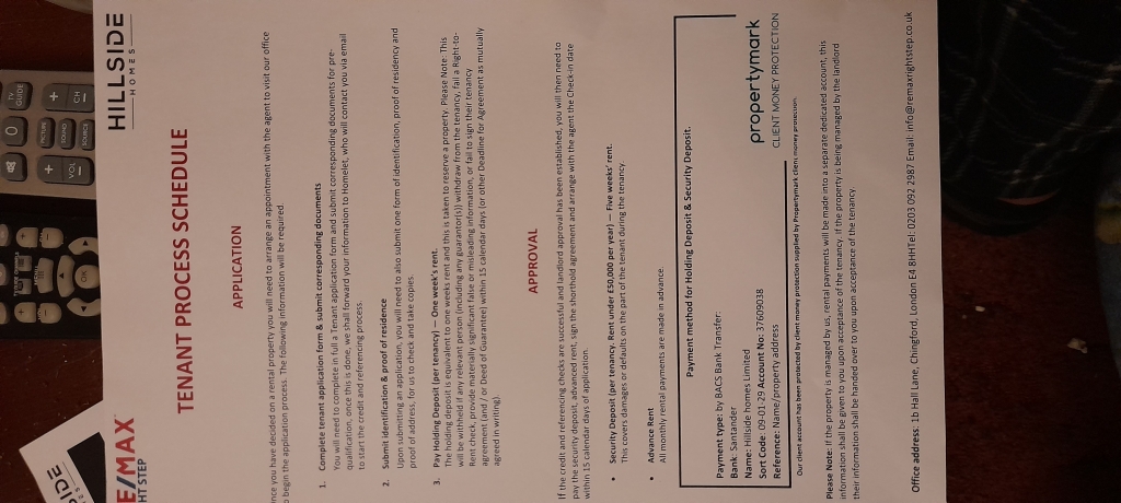 Going through the Tenant process schedule.... DID NOT KNOW THAT NEED TO PROVIDE MORE DOCUMENTS THEN WHEN YOU BUYING HOUSE NOT JUST RENTING. :) ALL SO,NEED TO WAIT 14DAYS TO GO THROUGH ALL THIS AND THEN MAYBE YOU WILL GET AN ANSWER, .ANOTHER TRHU ABOUT THEM IS THAT THEY ASKING FOR TOO MUCH PERSONAL INFO,LIKE YOUR NATIONAL INSURANCE NUMBER...WHICH ONLY SPECIFIC COMPANIES CAN ASK LIKE,(THE GOVERNMENT NOT NOT ESTATE AGENCY) AND I AM PRETTY SURE THAT ...MY DETAILS WONT BE SAFE .. BUT ANY WAY I GOT BETTER PROPERTY FROM BETTER AGENCY WITH LESS HASSEL :) AND NO FEES and another very strange thing is that I can't find the office address underneath for the office! Very weird!
