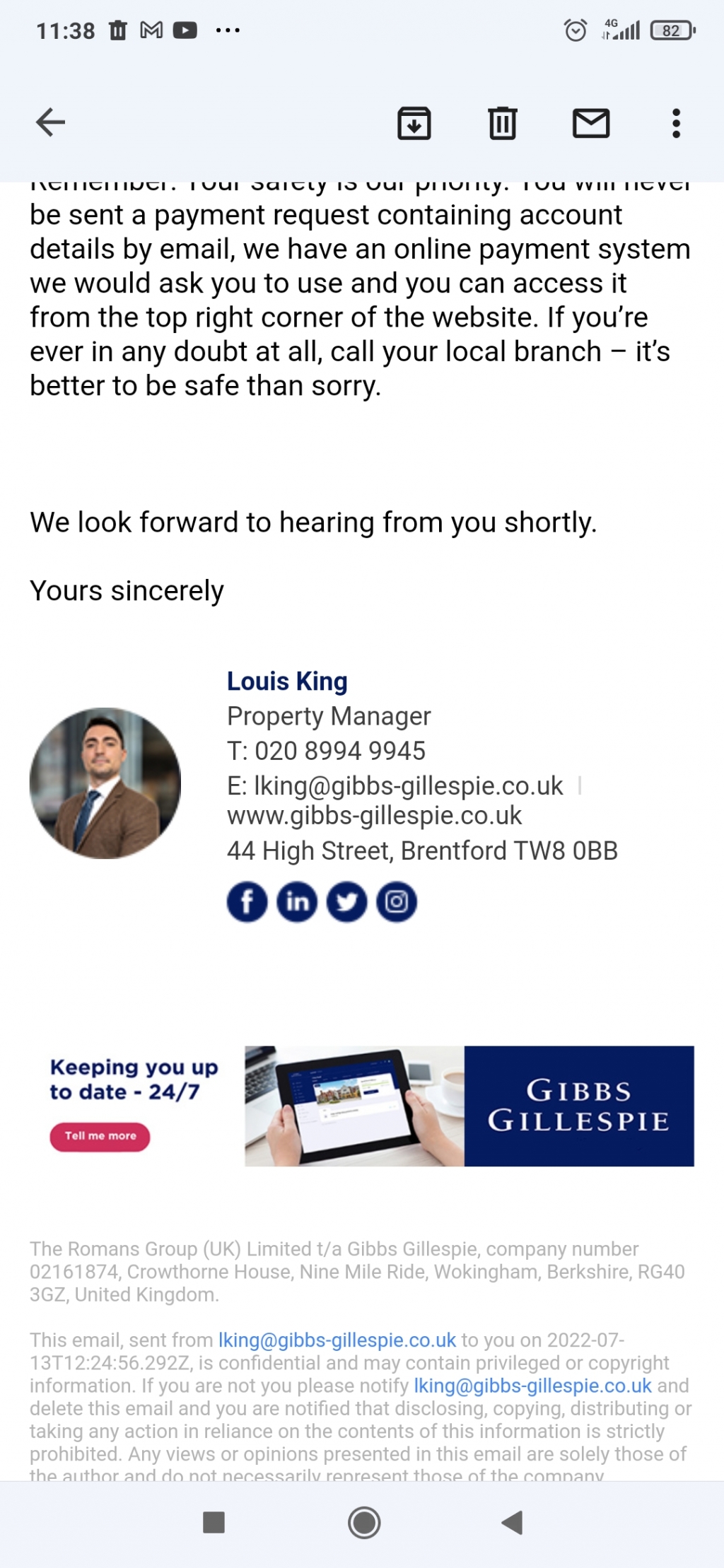 I have never worked with this agency but received an email from them. I don't know where they got information about me ...Not wanting to Renew? That is a shame! You MUST confirm your notice in writing to your branch ... Louis King Property Manager 44 High Street, Brentford TW8... Read Full Review