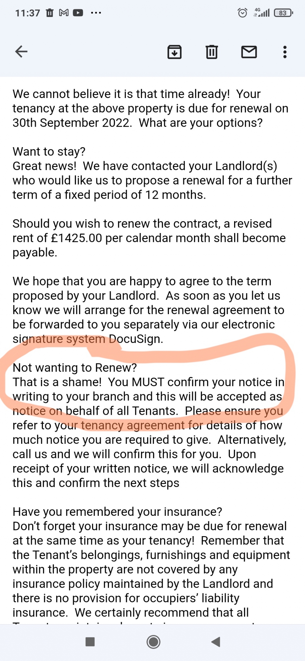 I have never worked with this agency but received an email from them. I don't know where they got information about me ...Not wanting to Renew? That is a shame! You MUST confirm your notice in writing to your branch ... Louis King Property Manager 44 High Street, Brentford TW8 0BB