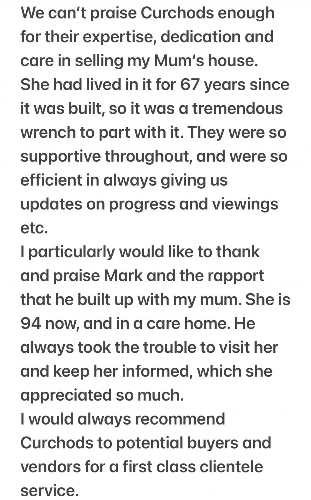 We can’t praise Curchods enough for their expertise, dedication and care in selling my Mum‘s house. She had lived in it for 67 years since it was built, so it was a tremendous wrench to part with it. They were so supportive throughout, and were so efficient in always giving us updates on progress and viewings etc. I particularly would like to thank and praise Mark and the rapport that he built up with my mum. She is 94 now, and in a care home. He always took the trouble to visit her and keep her informed, which she appreciated so much. I would always recommend Curchods to potential buyers and vendors for a first class clientele service.