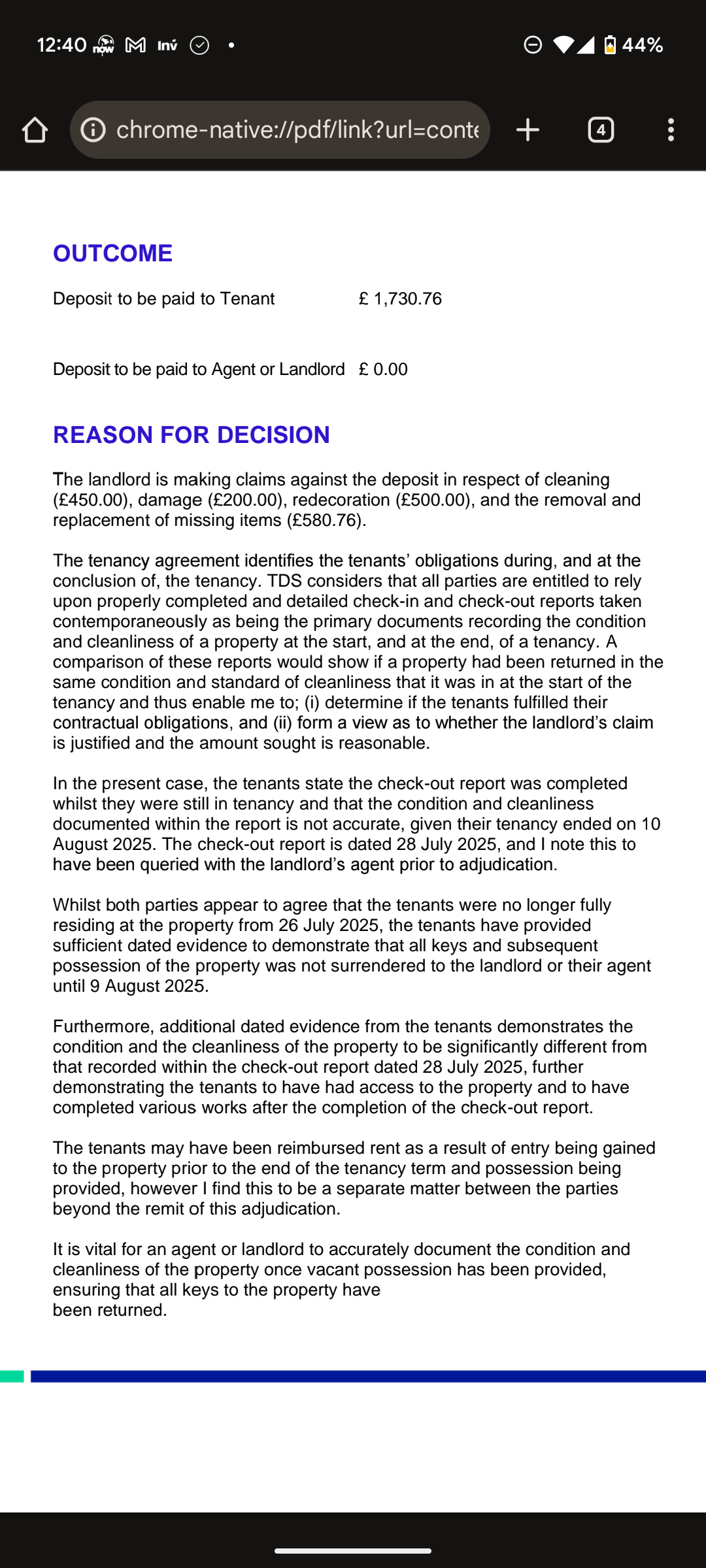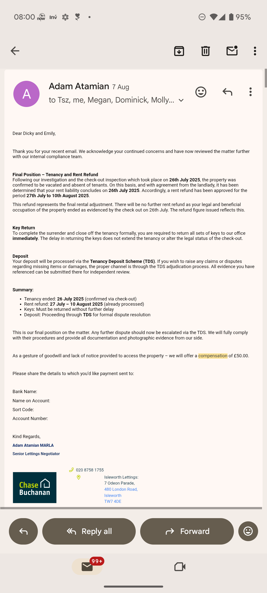 During our tenancy ending in August 2025, several serious mistakes were made by the agents involved: • Adam (Senior Lettings Negotiator) – incorrectly accused us of surrendering our tenancy early and insisted that we had “returned keys,” even though we had not. This led to the agency arranging a premature checkout inspection on 28 July, despite our tenancy ending on 10 August. • Kate (Lettings Agent) – we communicated transparently with her about allowing viewings and possibly ending early a tenant moved in. Instead of appreciating our cooperation, this was used as a assumption that we were surrendering the tenancy. • Molly (Property Management Manager) – handled the deposit claim aggressively, demanding the full deposit of £1,730.76, based on an invalid checkout report done before our tenancy legally ended. She ignored our explanations and photographic proof. Even worse, the agency sent a handyman into the flat on 2 August using their spare key without notice or consent, we were still tenants. The worker left the flat messy and removed items from the kitchen. This was a clear breach of quiet enjoyment and trust. We had also paid professional cleaning on 8 August, which took place after the agency’s mistaken early inspection. The matter went to the Tenancy Deposit Scheme (TDS), which reviewed all evidence and ruled that the landlord was entitled to nothing — confirming the agency’s report was invalid because it was carried out during our tenancy period. No one from the agency ever properly apologised. The experience was stressful, timeconsuming, and completely avoidable they had handled things professionally. If you’re renting in the Isleworth area, I strongly recommend being extremely cautious when dealing with this branch, especially with the abovementioned staff. Always communicate in writing and keep your own records and photos. This agency’s conduct has shown a worrying lack of professionalism and respect tenants’ legal rights.