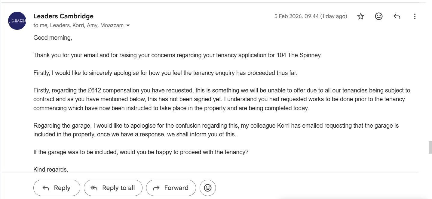 My experience with Leaders Cambridge has been one of the most unprofessional, horrible and chaotic encounters I have ever had with a letting agency. I wish there was a NO star option. I was initially told by two of their agents, Kori O’Neil and Amy Rutherford, that the garage advertised with the property could not be handed over, and that it had been incorrectly advertised. This was a major part of the listing and a key reason I applied the property. When I requested a refund of my £321.29 holding deposit, stating clearly that I did not wish to proceed with a property that was misrepresented, another agent, Jake, suddenly emailed me claiming it was all a “confusion” and that the garage could now be included. By this point, the inconsistency and lack of transparency were obvious red flags, and I no longer felt safe entering a tenancy with such disorganised management. Instead of acknowledging their mistakes, their CEO, Michael, called me and tried to frame the situation as I was backing out of the agreement despite the fact that I have written emails from Kori, Amy, and Jake confirming the garage was refused and the advertisement was incorrect. He insisted the holding deposit could not be refunded, even though the withdrawal was entirely due to their mismanagement and contradictory information. Because of their errors, I was forced to extend my hotel stay, paying an additional £612, completely outside my budget and planning. I was left without a property, out of pocket, and having to start the search all over again ,including paying another holding deposit elsewhere. This entire experience has shown a lack of professionalism, poor internal communication, misleading advertising, and no accountability the financial and emotional impact on prospective tenants. I would strongly advise others to be cautious when dealing with L|Leaders Cambridge Branch 140 Hills Rd CB2 8PB.